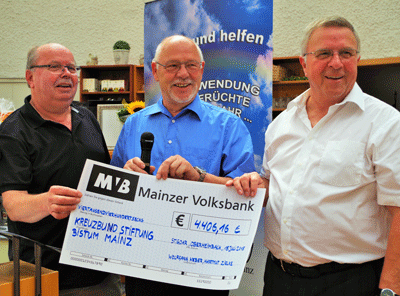 Im Rahmen des Festaktes überreichten Wolfgang Weber und Hartmut Zielke, die beiden Binger Organisatoren des Benefizkonzertes zugunsten der Kreuzbund Stiftung im Bistum Mainz, symbolisch einen Scheck über den Reinerlös des Konzertes mit dem Landespolizeiorchester Rheinland Pfalz vom 22.05.2015 aus Kartenverkauf, Spenden und Sponsoring in Höhe von 4.406,16 € an den Kuratoriumsvorsitzenden Herbert Rogge..