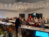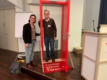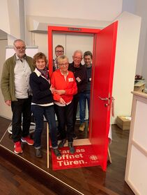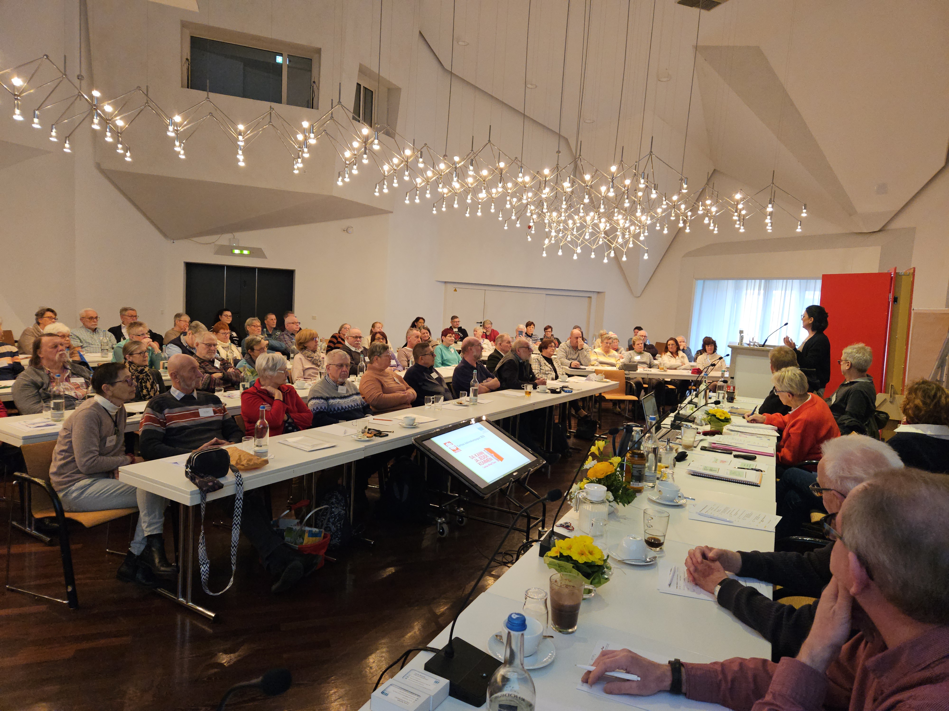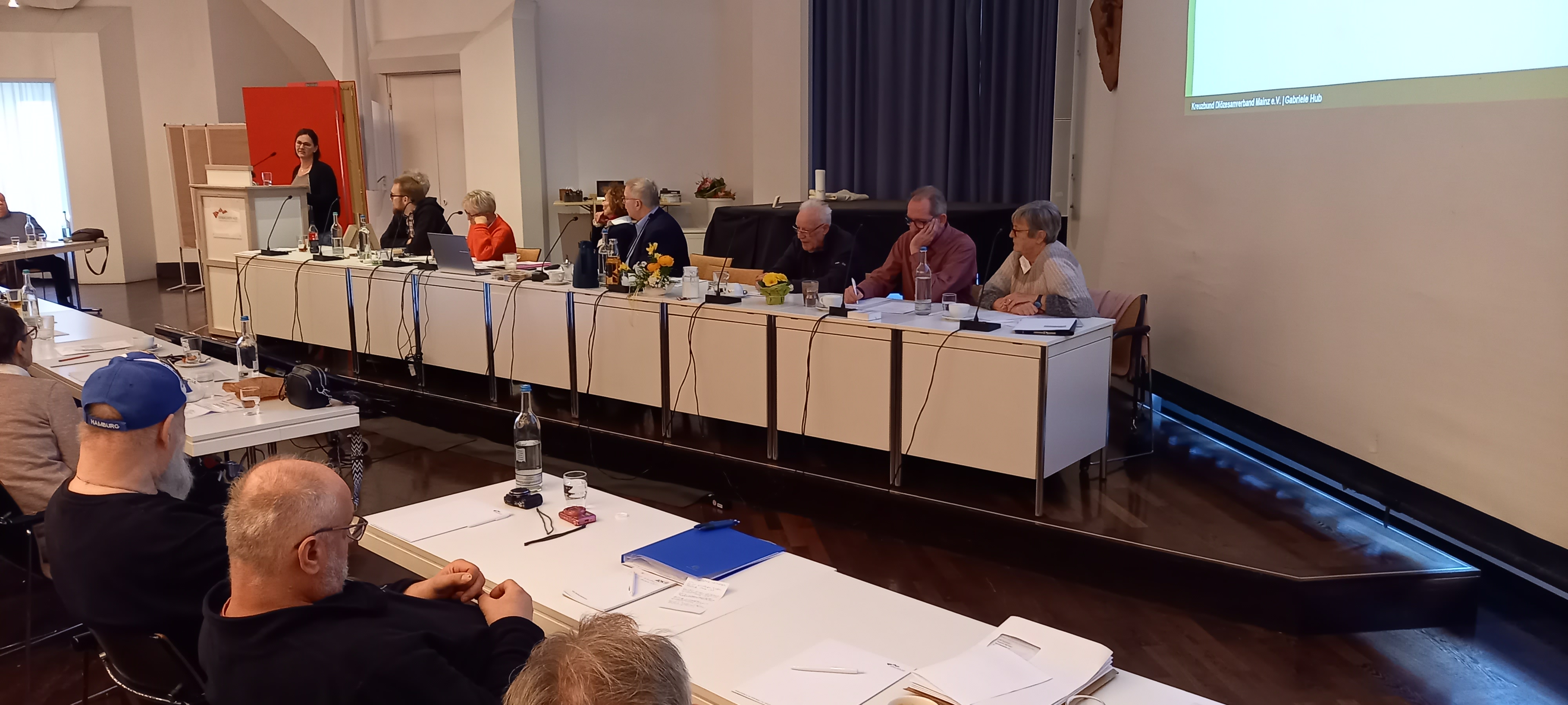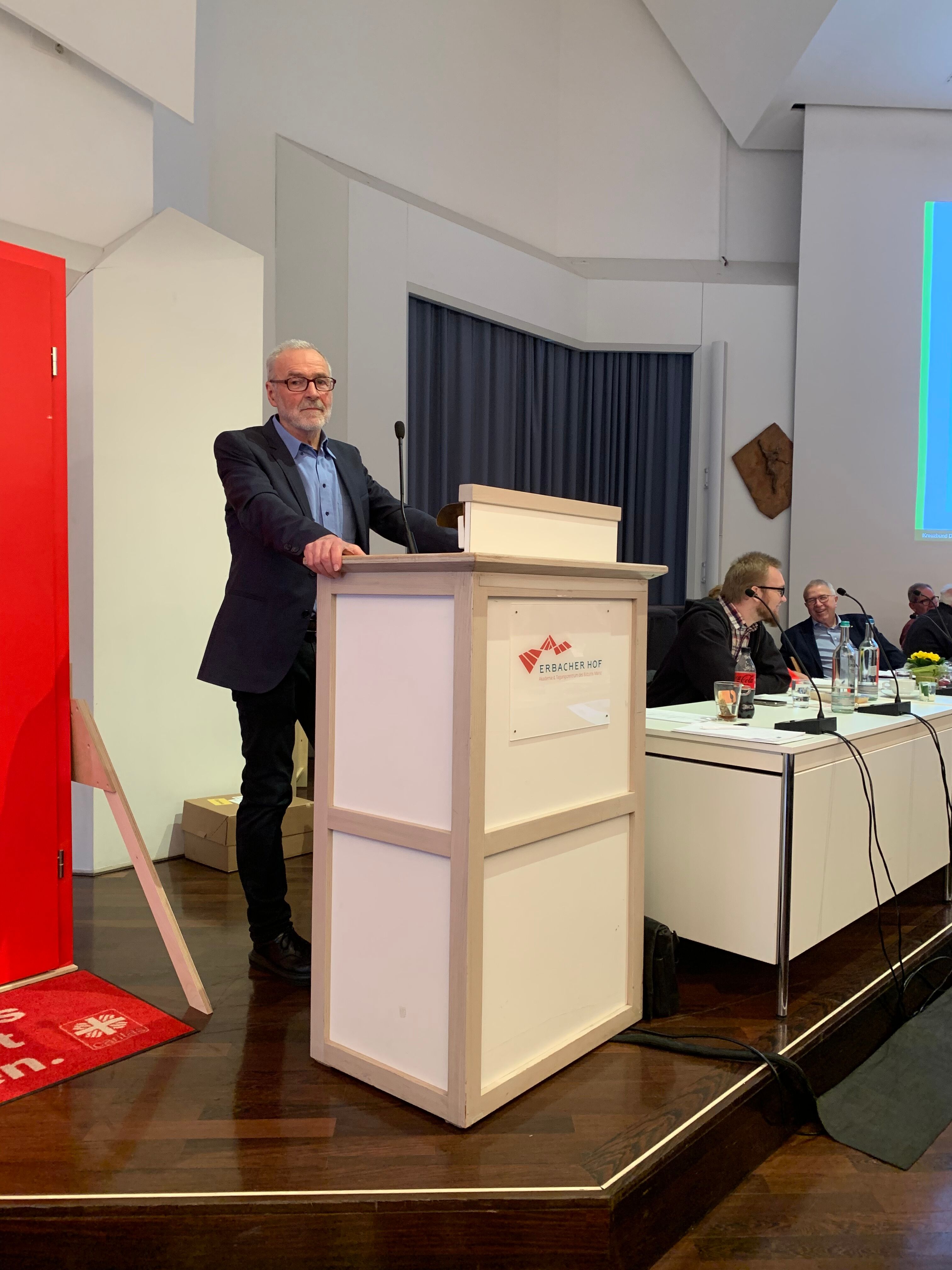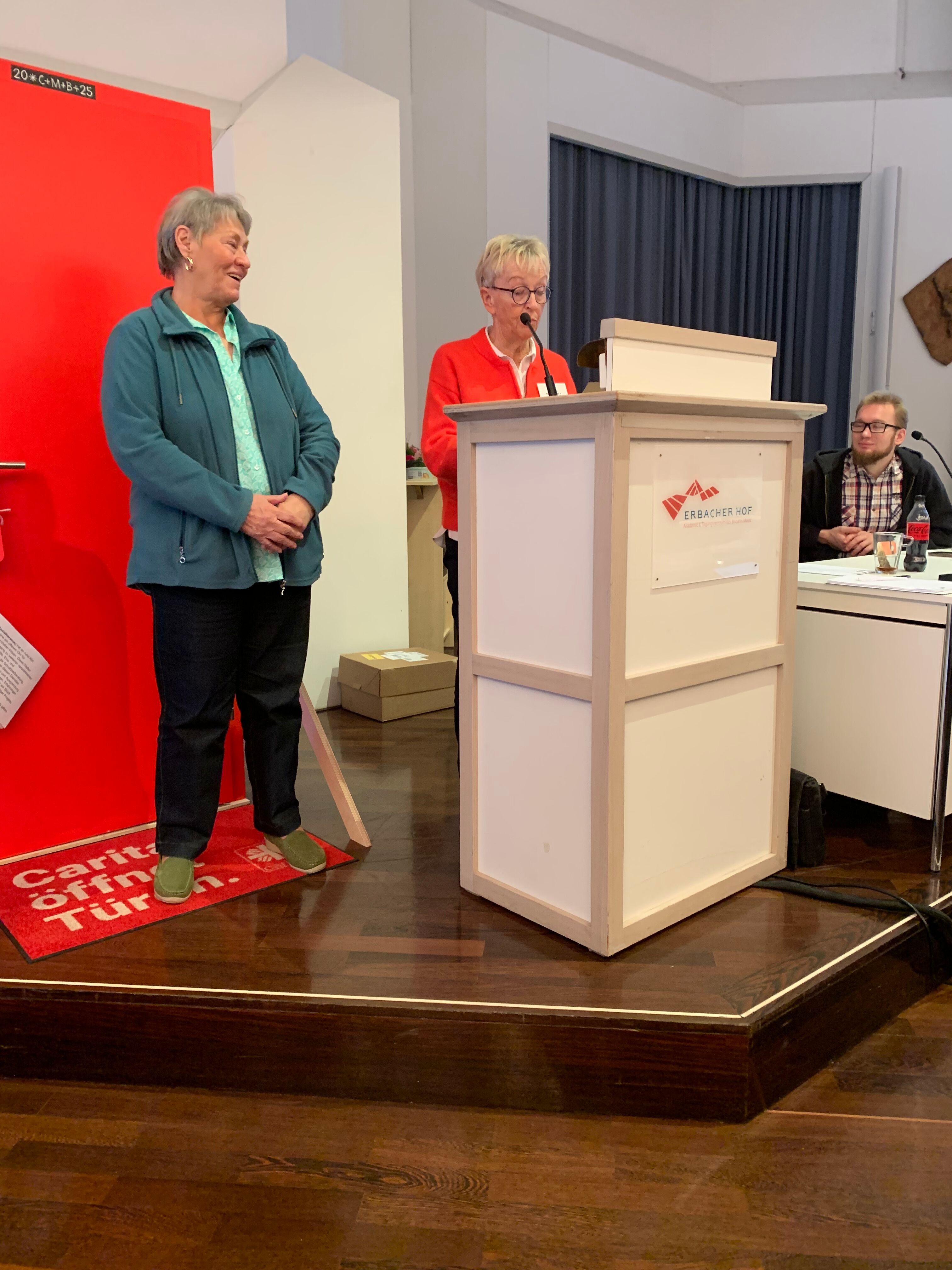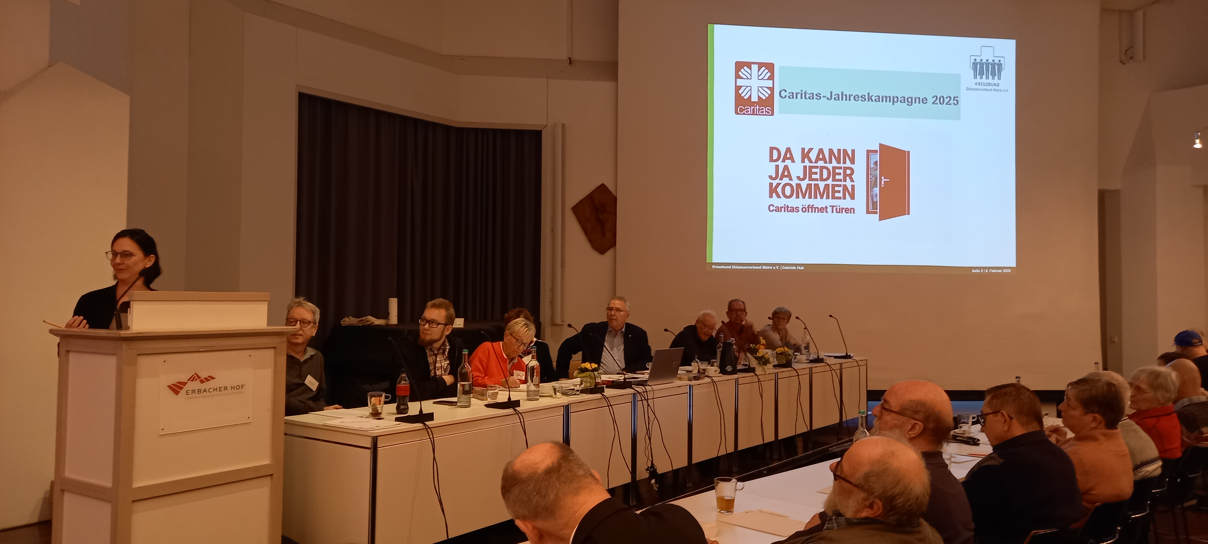 Nach den Regularien stellte Kerstin Öhl die Jahreskampagne 2025 der Caritas „Da kann ja jeder kommen, Caritas öffnet Türen“ vor. Eine offene rote Tür war als Symbol christlicher Nächstenliebe auf der Bühne des Erbacher Hofes aufgebaut. Die Caritas möchte die Türen offenhalten und keine Diskriminierung von Randgruppen dulden. Kerstin rief uns auf, Menschen nicht auf ein Manko zu reduzieren und Menschen in Not zu unterstützen. In Anbetracht der anstehenden Bundestagswahl appellierte sie an uns, demokratische Parteien zu unterstützen. „Frieden beginnt nicht nur bei mir, sondern auch mit meiner Stimme“.