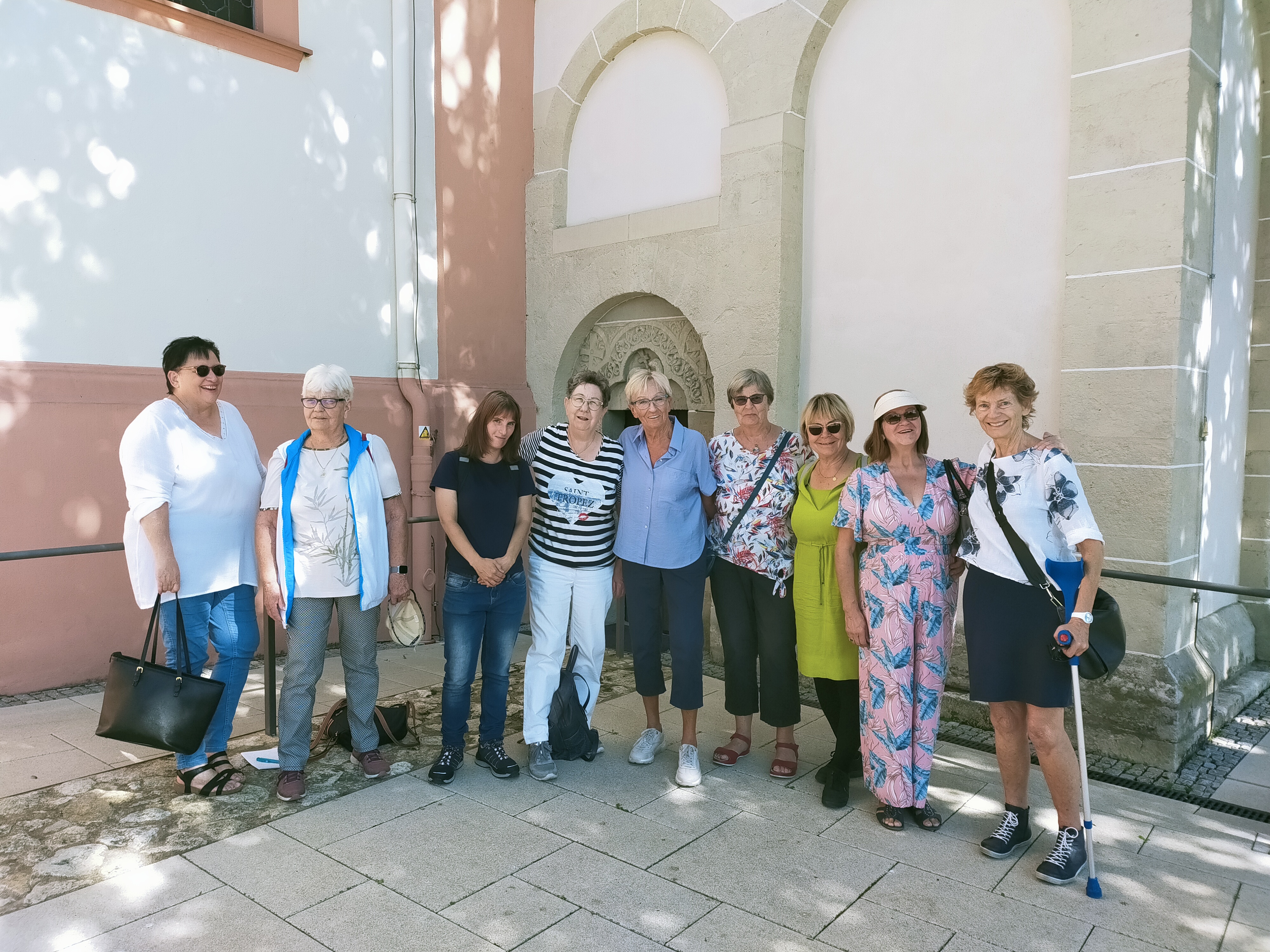 Neun Weggefährtinnen (es hätten ruhig ein paar mehr sein dürfen!) trafen sich in Ingelheim zunächst zu einem guten Morgenkaffee, um sich dann auf den Weg ins Ingelheim z.Zt. Karl des Großen zu machen. Das Wetter hätte nicht schöner sein können, und morgens wehte auch noch so ein leichtes Lüftchen.