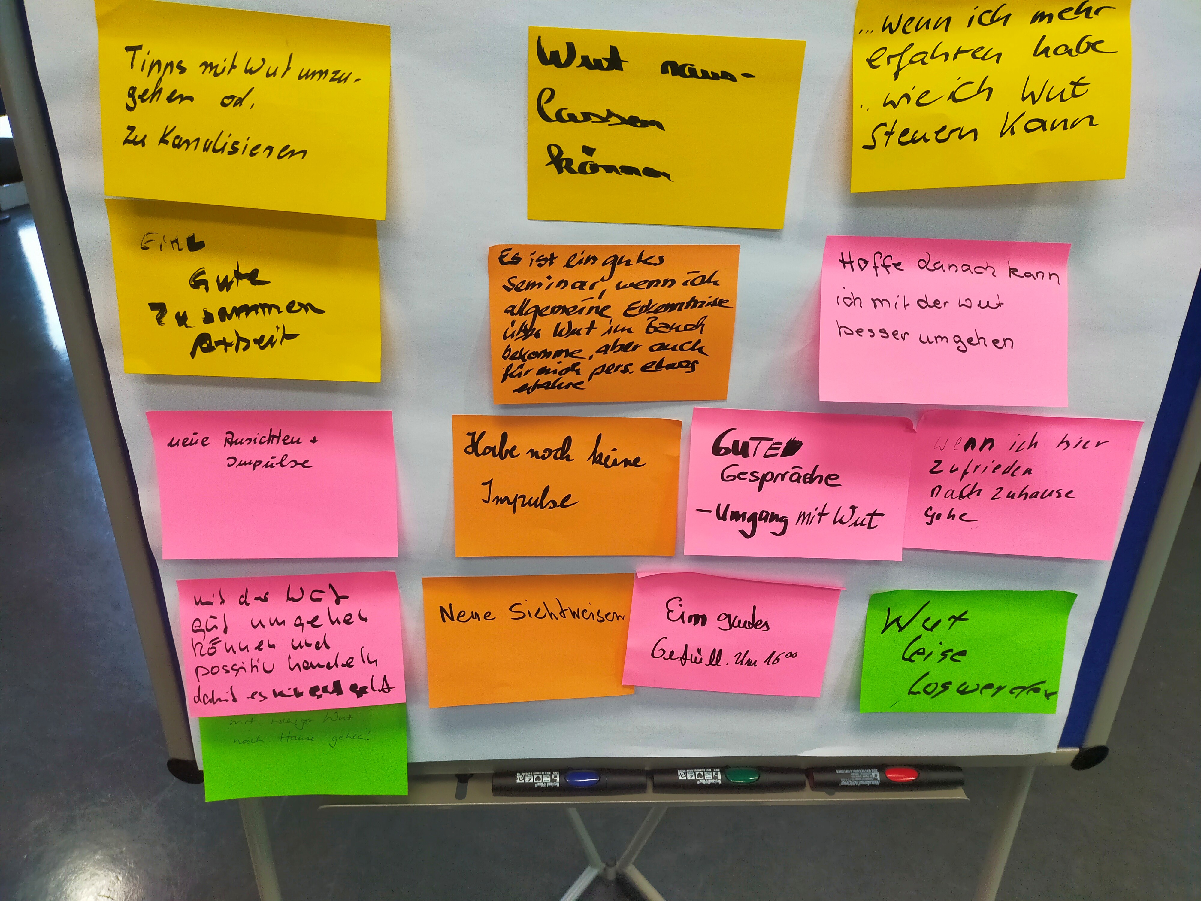In einem anfänglichen „Speed Dating“ äußerten die TN ihre Erwartungen an das Thema „Wut im Bauch“, um nach dem Seminar zufrieden nach Hause gehen zu können. Ein Schreibgespräch zu den Themen wie „Wut ist für mich…“, „Wenn meine Wut verraucht ist.“, „Wenn ich wütend bin“, „Wenn es keine Wut gäbe“ und „Wenn jemand auf mich wütend ist“ zeigt, dass Wut z.B. befreiend wirken aber auch hilflos machen kann. Wenn es keine Wut gäbe, würden wir vielleicht wieder trinken!!??