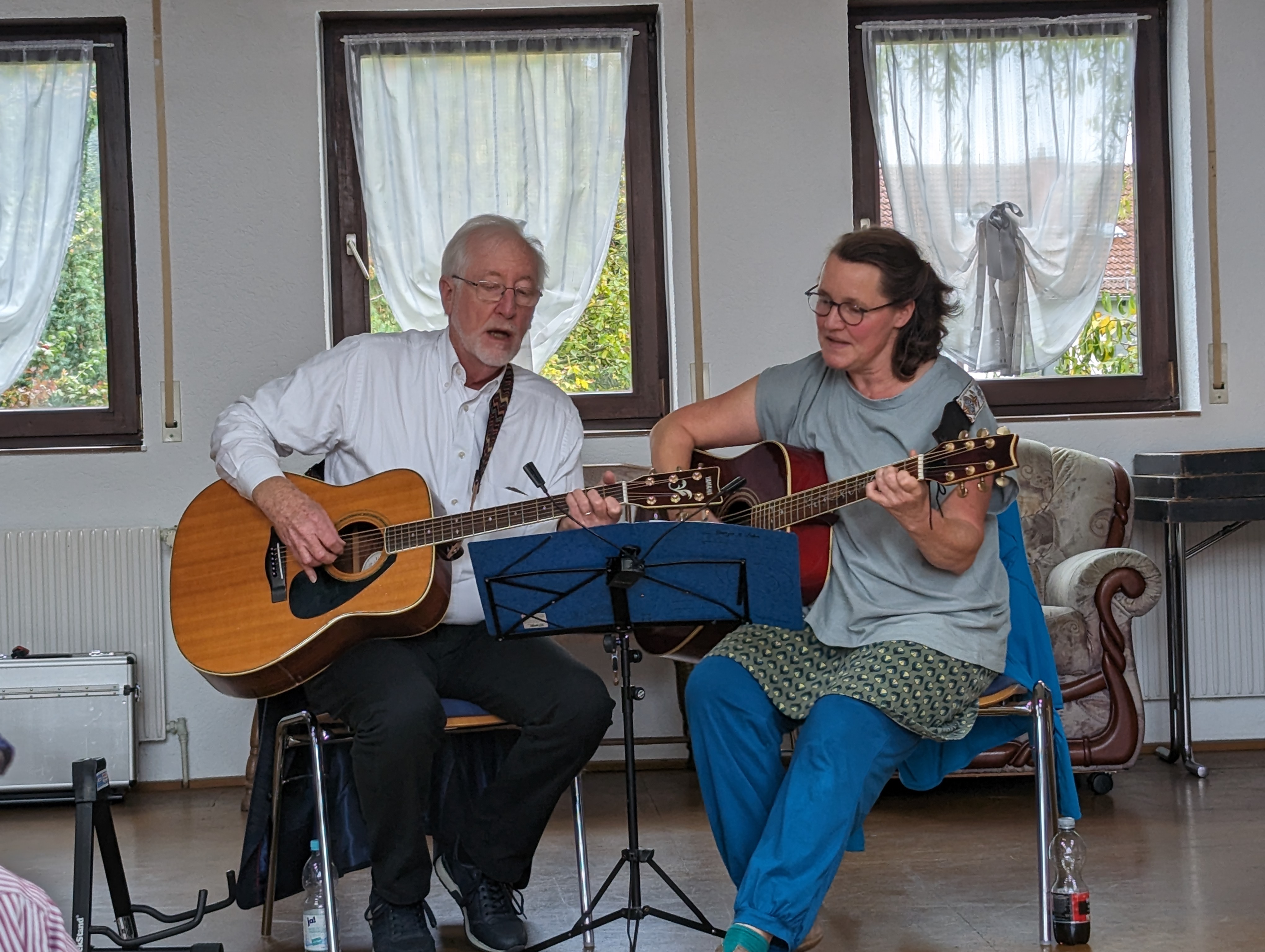Das „bunte“ in der Bekleidung hat nicht so ganz funktioniert, aber die Stimmung war sehr gut. Die musikalische Unterhaltung auf den Gitarren von John Winter und Sonja war sehr angenehm, und Zeit für Gespräche und Austausch gab es auch.