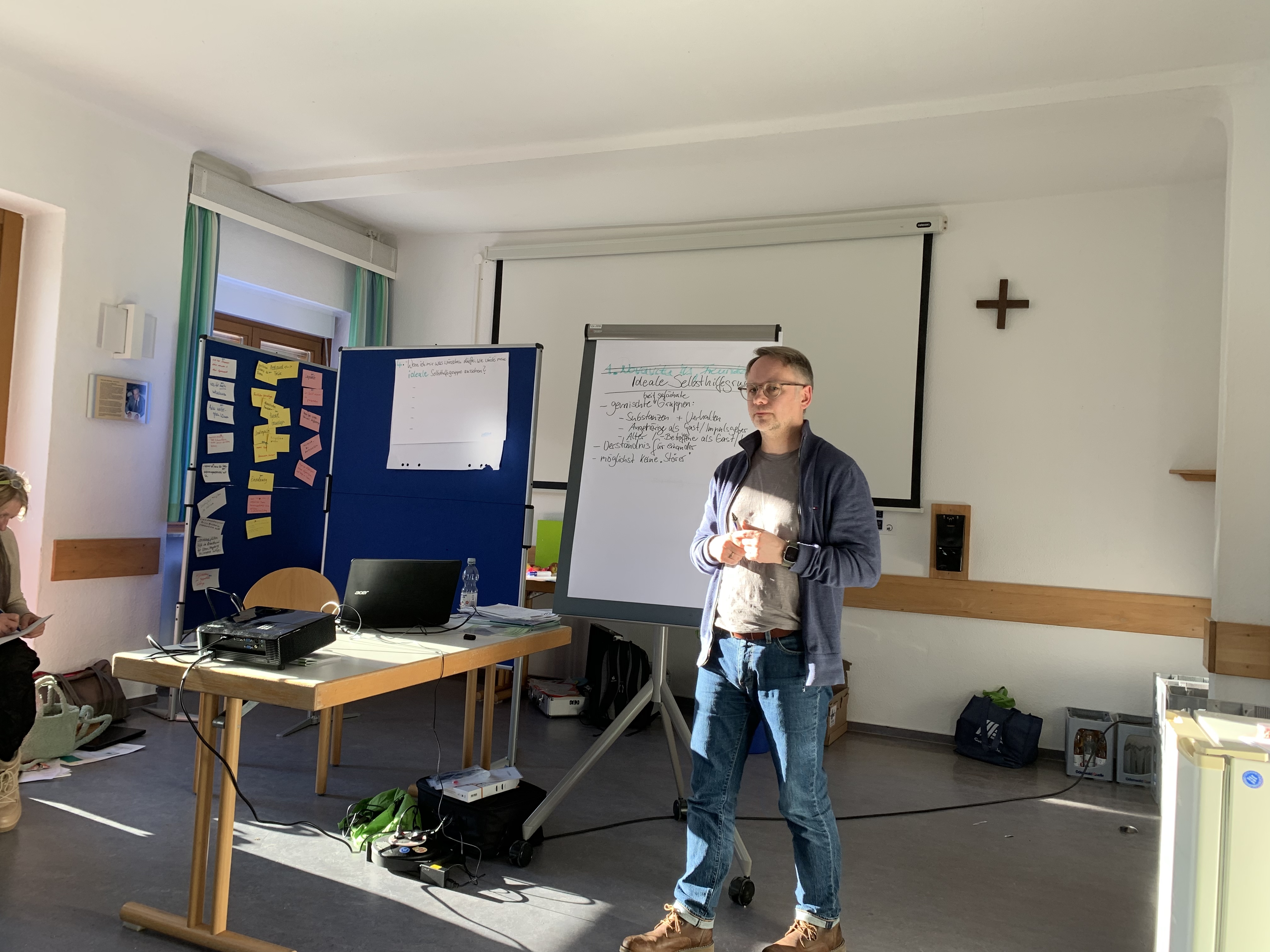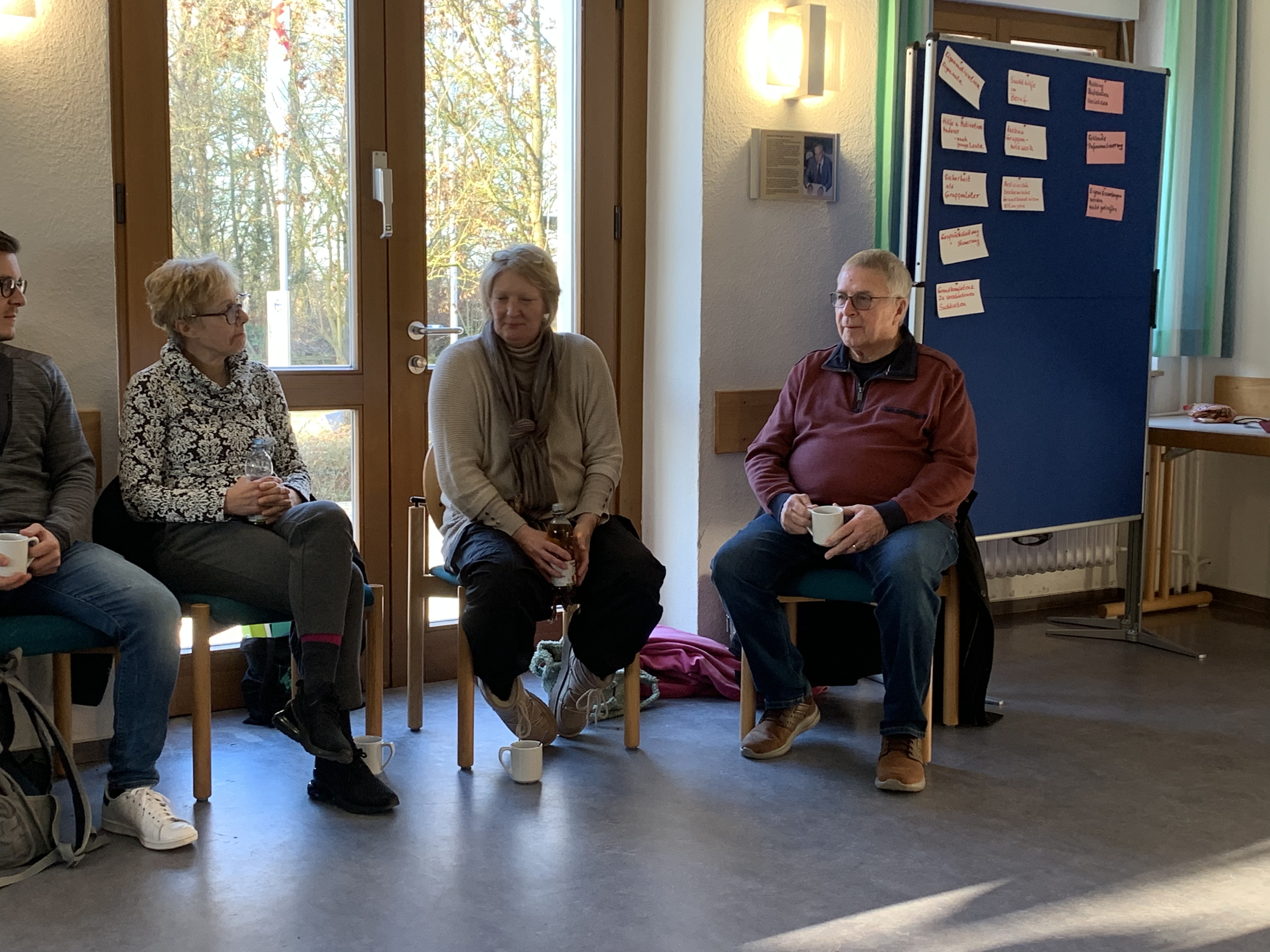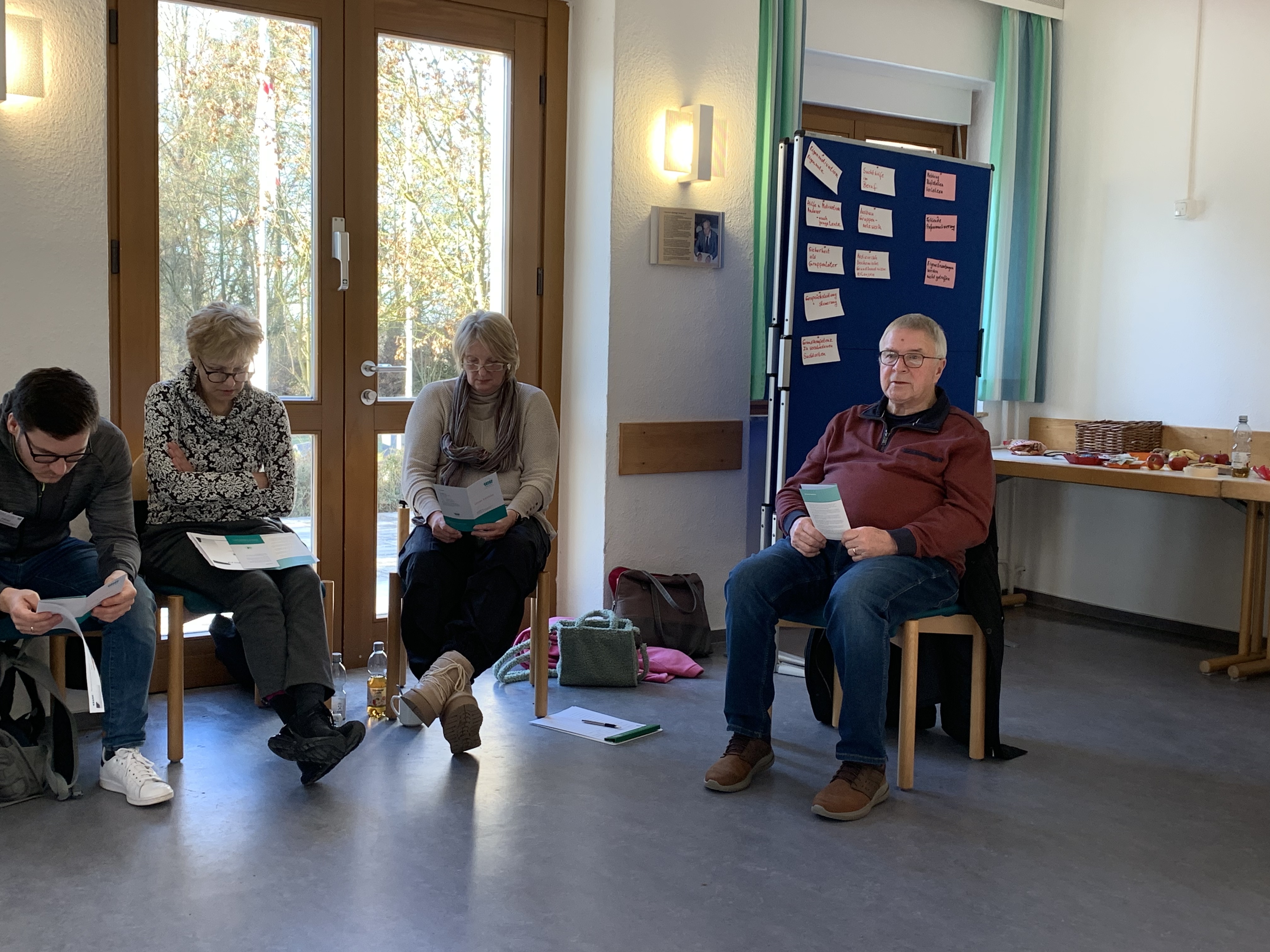 Der zweite Tag startete mit einem freiwilligen Entspannungsimpuls, der durch die Geschichte „Vom Mönch und dem Brunnen“ inspirierte. Danach übernahm Herbert Rogge, Geschäftsführer des Diözesanverbands Mainz und führte die Gruppe in die grundlegenden Organisationsformen der Suchtselbsthilfe ein. Anschließend tauchten die Teilnehmenden in intensiven Gruppenarbeiten in ihre eigenen Erfahrungen ein und reflektierten ihre Erwartungen an die ehrenamtliche Tätigkeit.